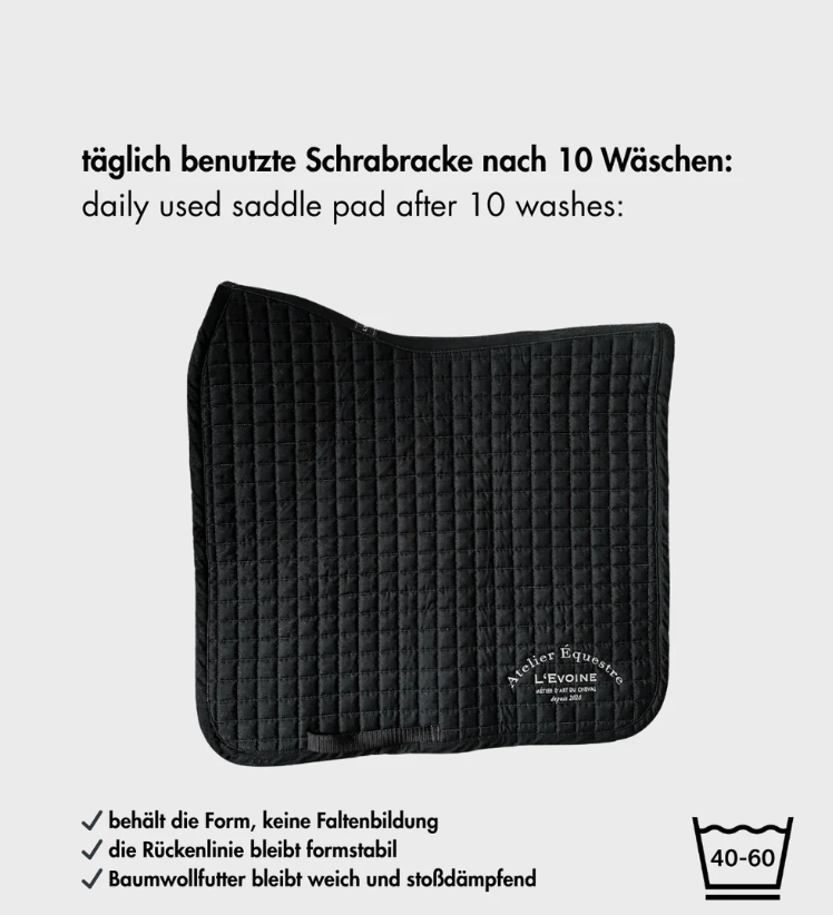 Die Schabracke kann bei 40 - 60 Grad gewaschen werden und wird in Deutschland von L'Evoine hergestellt.