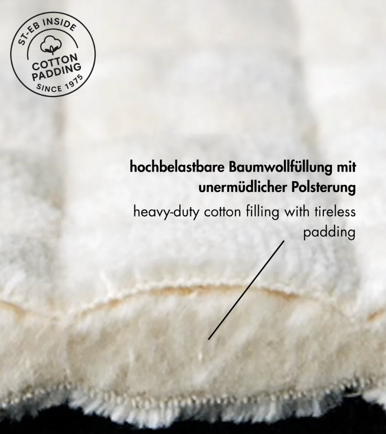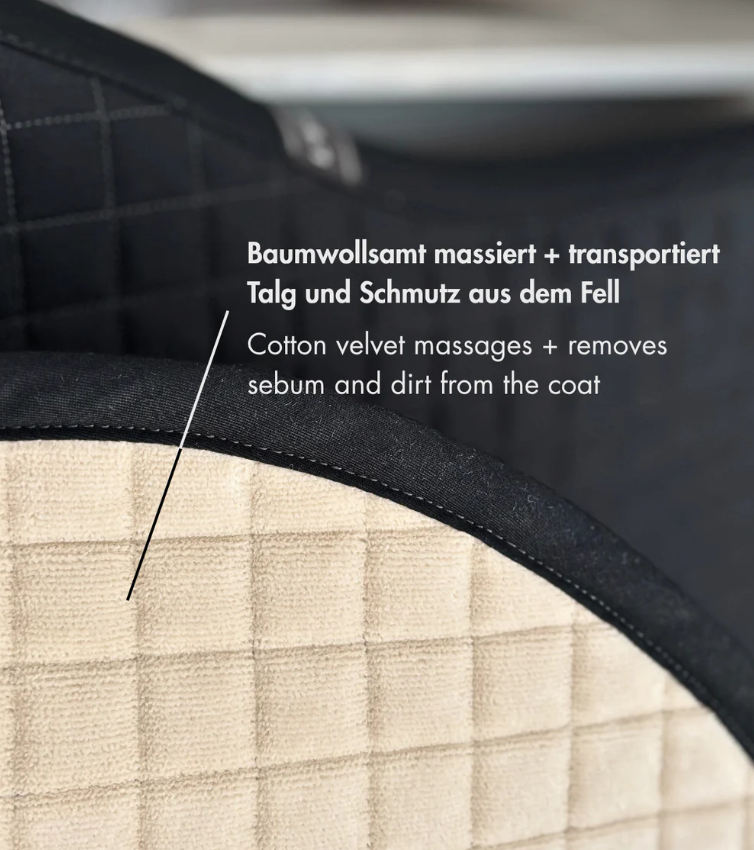 Die Verwendung von 100 % Baumwolle verhindert einen Wärmestau zwischen Pferderücken und Schabracke. Weicher, natürlicher Baumwollmolton sorgt für zusätlichen Komfort und und verbessert die Thermoregulation. Schweiß wird vom Pferd aufgenommen. Die Baumwollschabracke ist besonders ergonomisch geformt und hat eine hohe Widerristfreiheit.